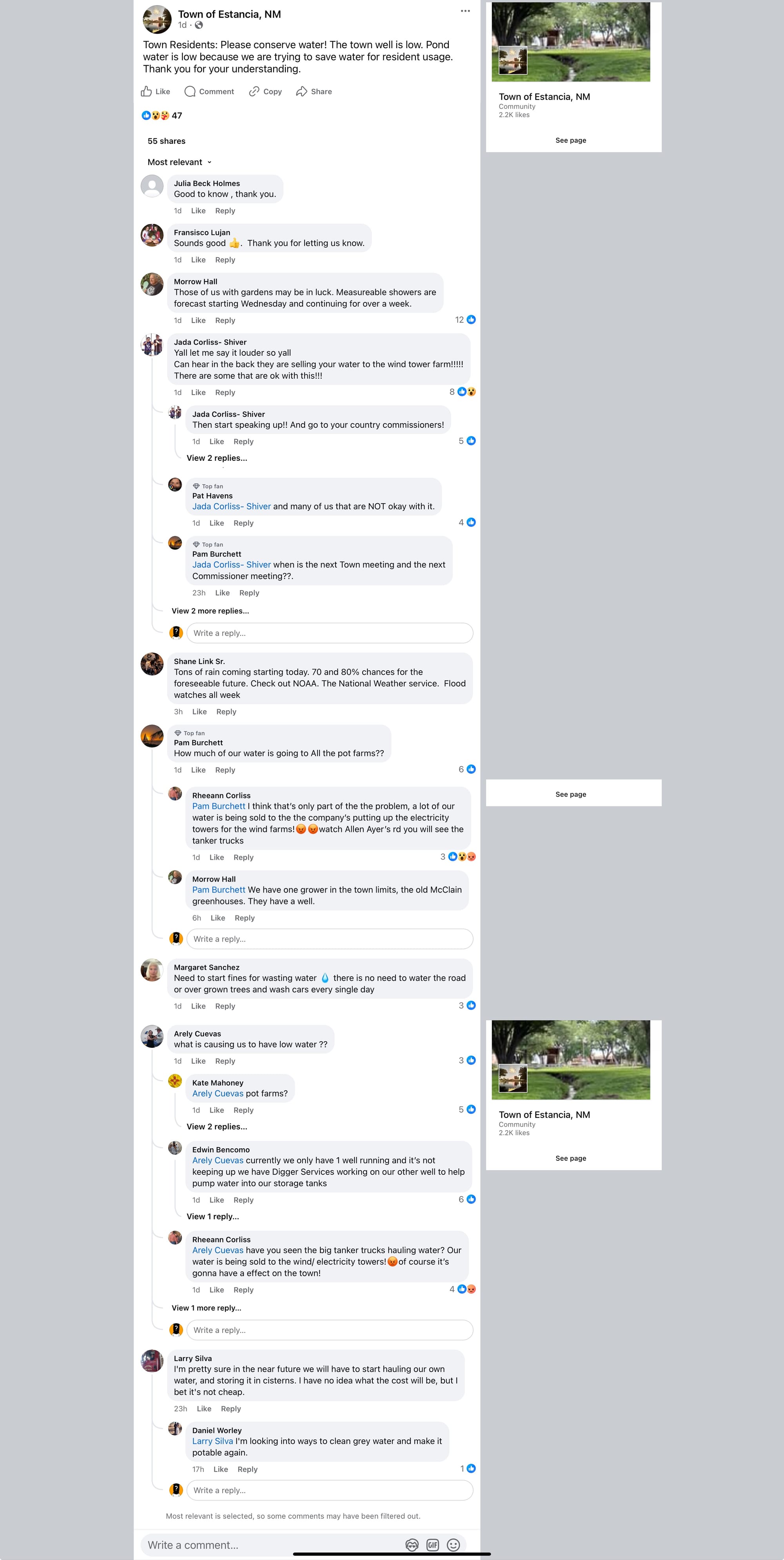 In response to the town’s notice on Facebook requesting that residents conserve water, some blamed the low water level in the residential well on the wind farms operating and under construction on the east side of Torrance County. Others blamed commercial cannabis cultivators. Estancia Trustee Morrow Hall responded to this claim by saying there was only one cannabis cultivator in town and it operated on its own well system, not on the residential water lines. County Commissioner Sam Schropp responded, "No," to the claims that selling water and cannabis cultivation were the reasons for the water shortage. Estancia resident Larry Silva commented, "I'm pretty sure in the near future we will have to start hauling our own water, and storing it in cisterns. I have no idea what the cost will be, but I bet it's not cheap."