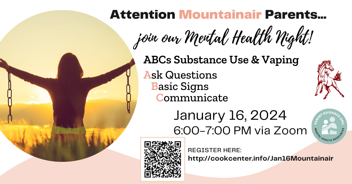 Mountainair Public Schools will be having a Mental Health Night on January 16, 2024, from 6:00 PM to 7:00 PM, that is co-sponsored by the Cook Center, a non-profit out of Utah, regarding vaping and substance use. This will be an online event, via Zoom, and parents can register at this link: http://cookcenter.info/jan16mountainair