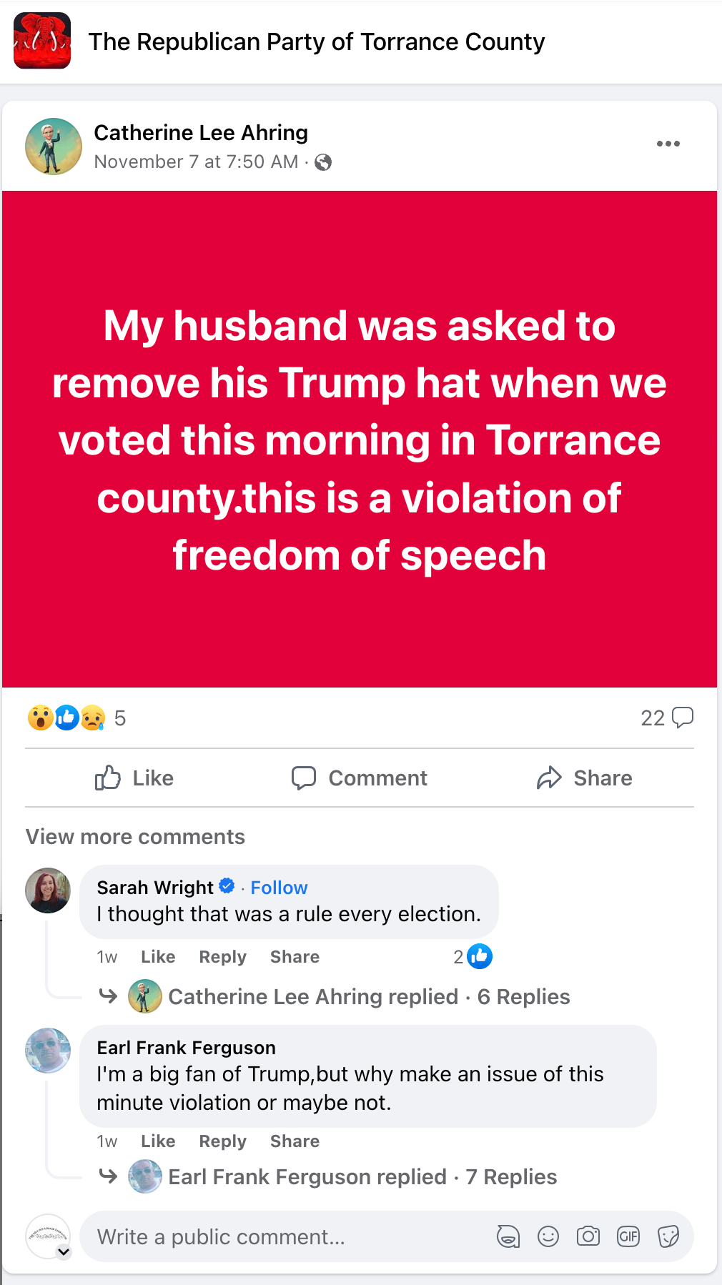On election day, while voting at the Moriarty Civic Center polling station, Catherine Lee Ahring and her husband Shay were approached by a polling station volunteer. The polling worker told her husband that he had to remove his hat, adorned with the Trump campaign slogan, "Make America Great Again." After Shay Ahring removed his hat, he voted at the Moriarty polling station. Later, Ahring would express frustration regarding the experience. “My husband was asked to remove his Trump hat when we voted this morning in Torrance County.this is a violation of freedom of speech,” Ahring wrote on the Facebook page for the Republican Party of Torrance County.