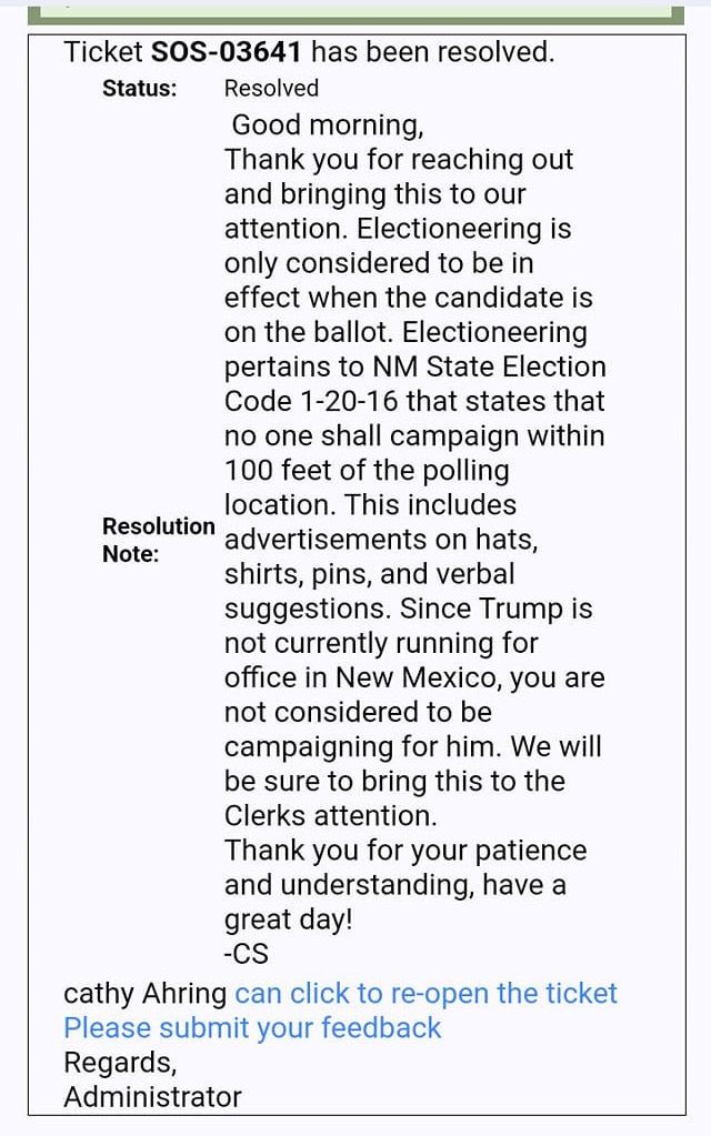 Ahring contacted the New Mexico Secretary of State’s office regarding the matter, who said that Ahring and her husband were allowed to wear Trump paraphernalia despite the state’s electioneering provisions codified at NMSA 1-20-16, as Trump was neither one of the candidates running for election in the current year nor the subject of one of the referenda on the ballot in the current year.