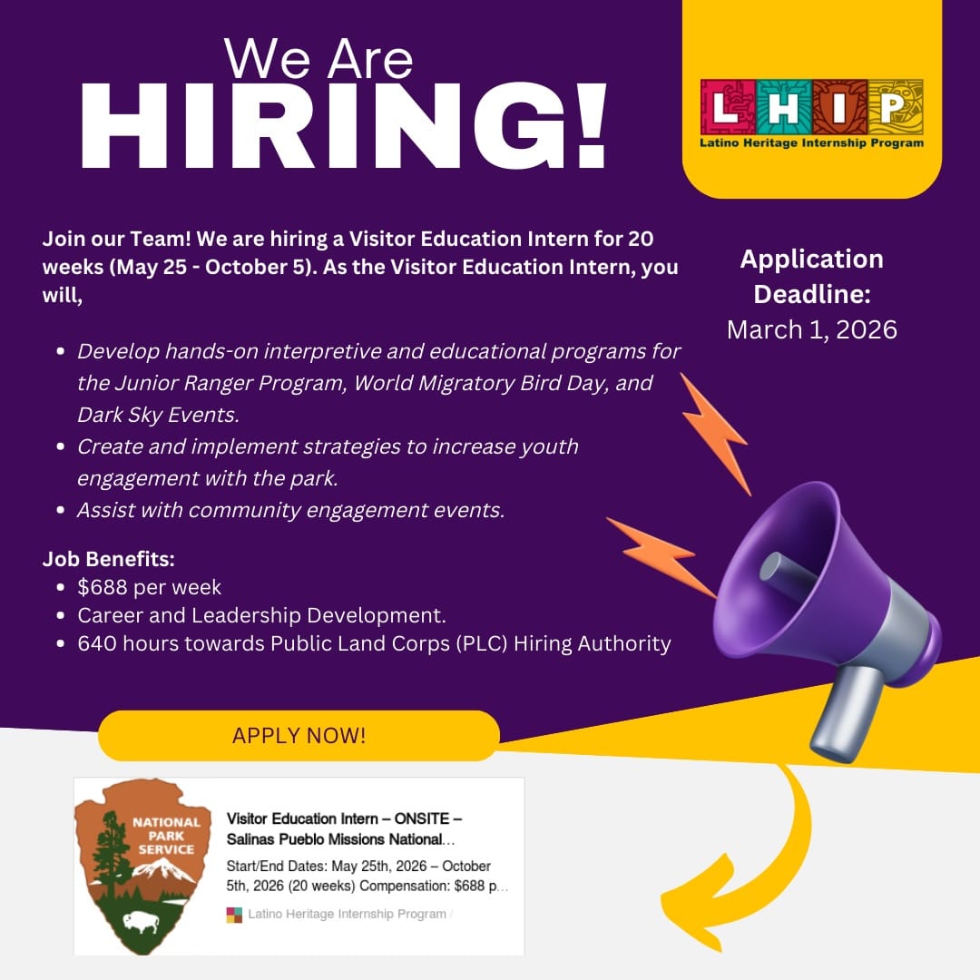 Salinas Pueblo Missions National Monument is hiring a Visitor Education Intern to join its Interpretation and Visitor Services team from May through October 2026.