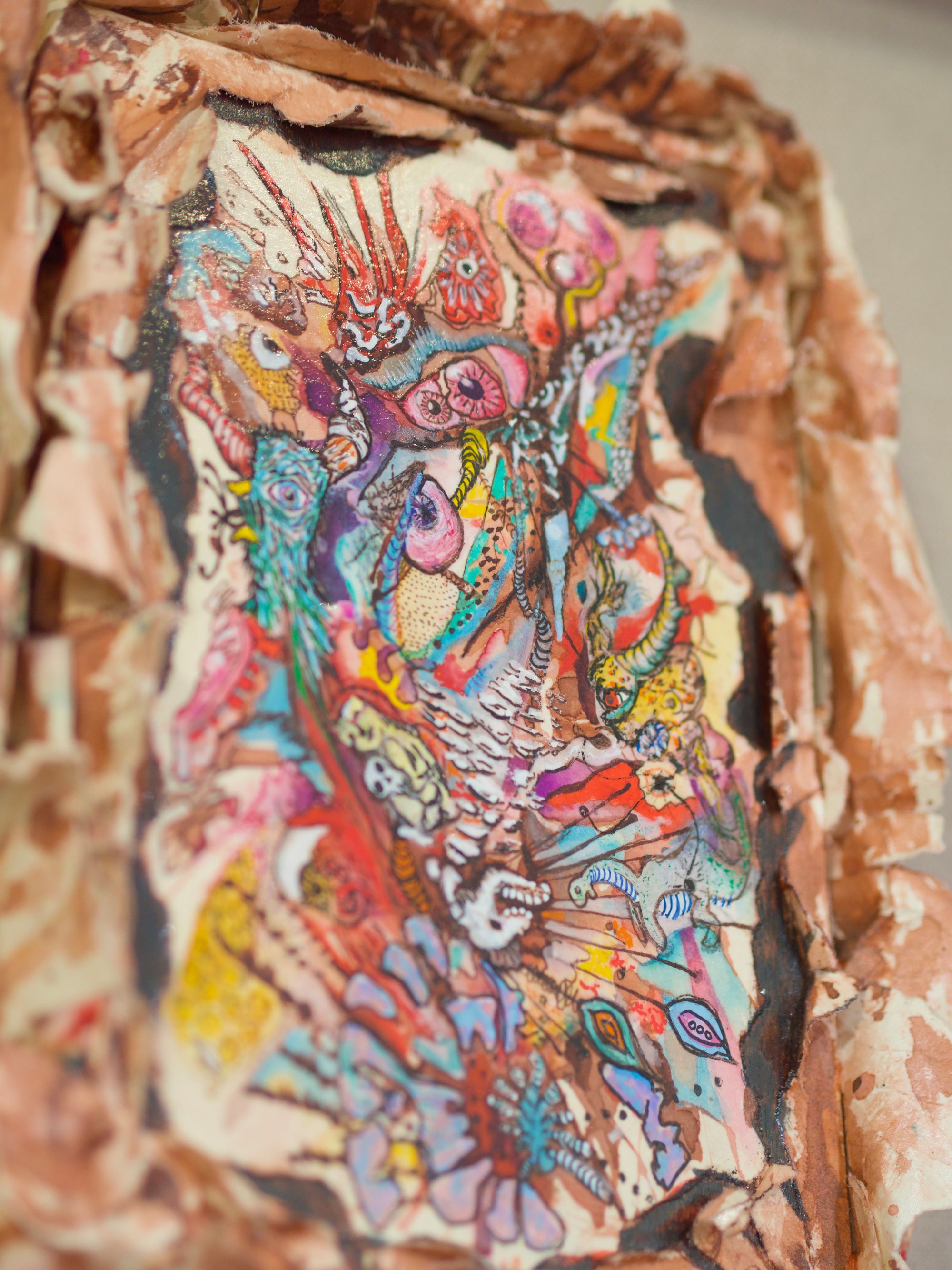 Nieto, slyly, does not discuss the portals as fictional things. He cautioned Rebecca Anthony, who organized Nieto’s exhibition at La Galeria at the Shaffer, that he could not work with many portals in his studio because of their gravitational pull. He also warned attendees at the opening of his exhibition that there are creatures in his portals, looking back at those who look at them.