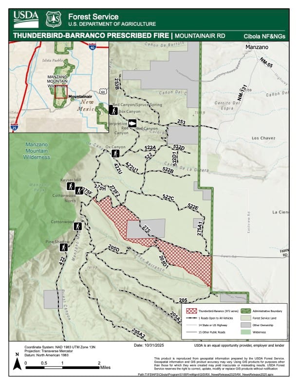 Smoke may be visible from Mountainair, Punta de Agua, Manzano, the Estancia Valley, and nearby subdivisions. Some areas around the burn units may be temporarily closed for public safety, and drivers should watch for warning signs and be prepared for reduced visibility.