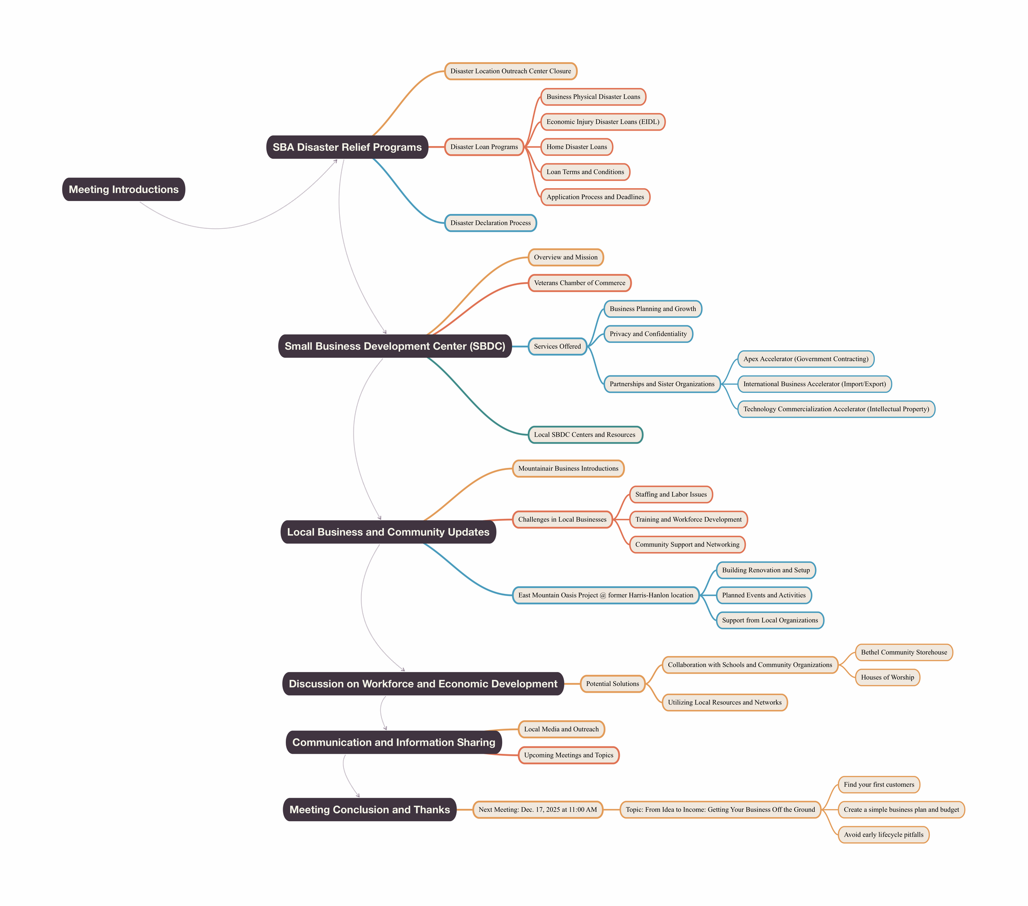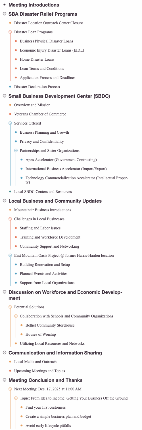 Next month's meeting will be on December 17, 2025, at 11:00 AM. Our topic will be From Idea to Income: Getting Your Business Off the Ground, and will cover: