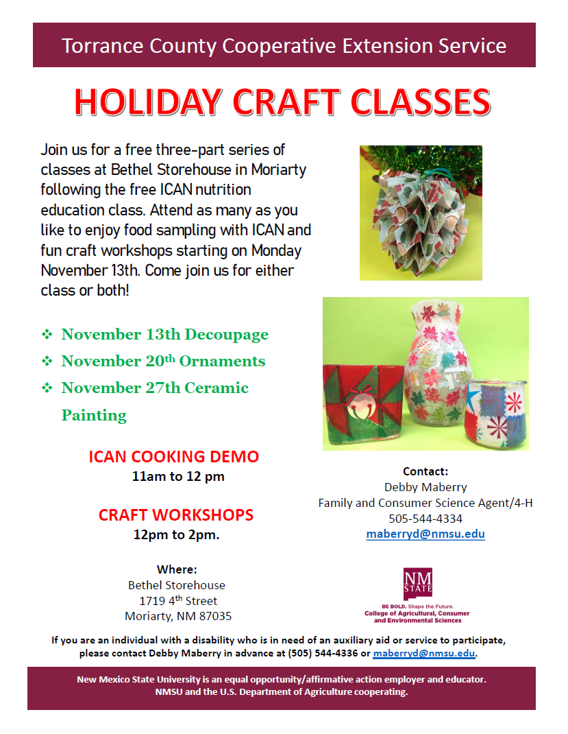 Debby Maberry is the point of contact for these craft workshops; she can be contacted at 505-544-4336 or maberryd@nmsu.edu for questions.