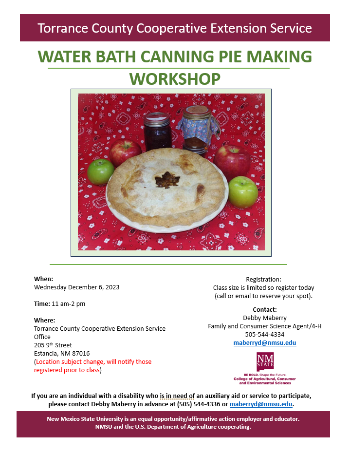 Next is water bath canning and pie-making on Wednesday, December 6, 2023, from 11:00 AM to 2:00 PM. You will need to register to attend this event, and class size is limited. Learning canning is a great way to develop a side income, such as selling salsas or jams, and learning canning without succumbing to botulism is even greater. TCCES will host a four-hour canning class at its offices at 205 9th Street, Estancia, NM 87016. To register, contact Debby Maberry at 505-544-4334 or maberryd@nmsu.edu.