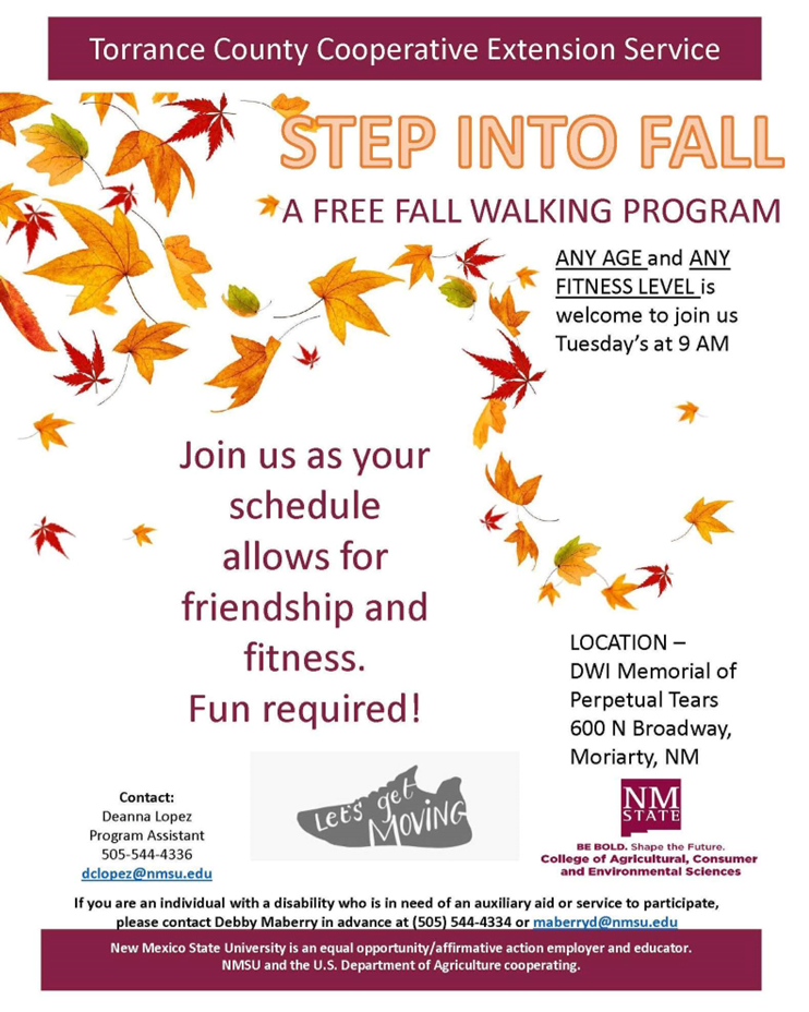 Debby Maberry of the Torrance County Cooperative Extension Service - New Mexico State University (TCCES) was kind enough to share the TCCES's fall programs. The first of these, Step Into Fall, is a walking program for people of all ages and walking abilities. Step Into Fall meets on Tuesdays at 9:00 AM at the DWI Memorial of Perpetual Tears, 600 North Broadway, Moriarty, NM. For more info, contact Deanna Lopez at 505-544-4336 or dclopez@nmsu.edu or Debby at 505-544-4334 or maberryd@nmsu.edu.