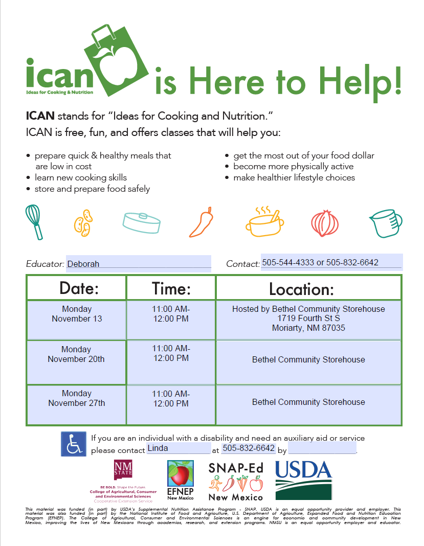 TCCES's next program is ICAN or "Ideas for Cooking and Nutrition," and will provide attendees with ideas on healthy, low-cost meal solutions, healthy lifestyle choices, and tricks to get the most out of your food budget. There are three sessions in this program, all at the Bethel Community Storehouse, 1719 Forth Street South, Moriarty, NM 87035: