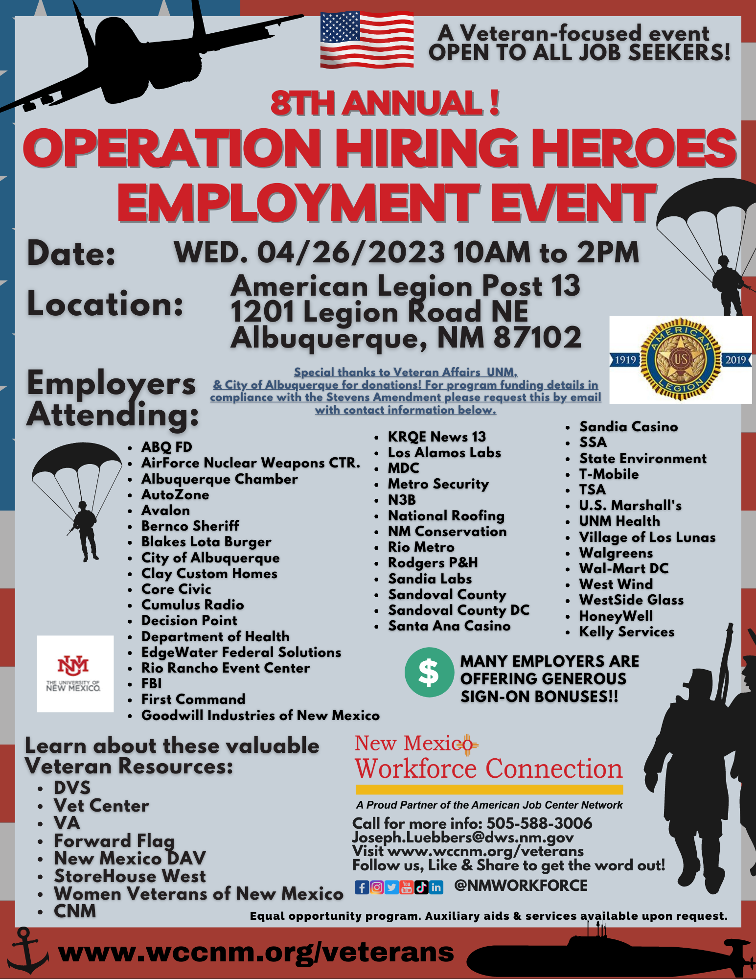 8th Annual Operation Hiring Heroes Employment Event: 10:00 AM - 2:00 PM, Wednesday, April 26, 2023, at American Legion Post 13, 1201 Legion Road NE, Albuquerque, NM87102