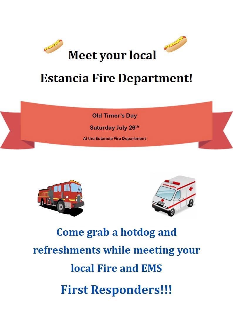 - Estancia Fire and EMS first responders will be grilling hot dogs and providing refreshments at the Estancia Old Timers' Day, July 26, 2025