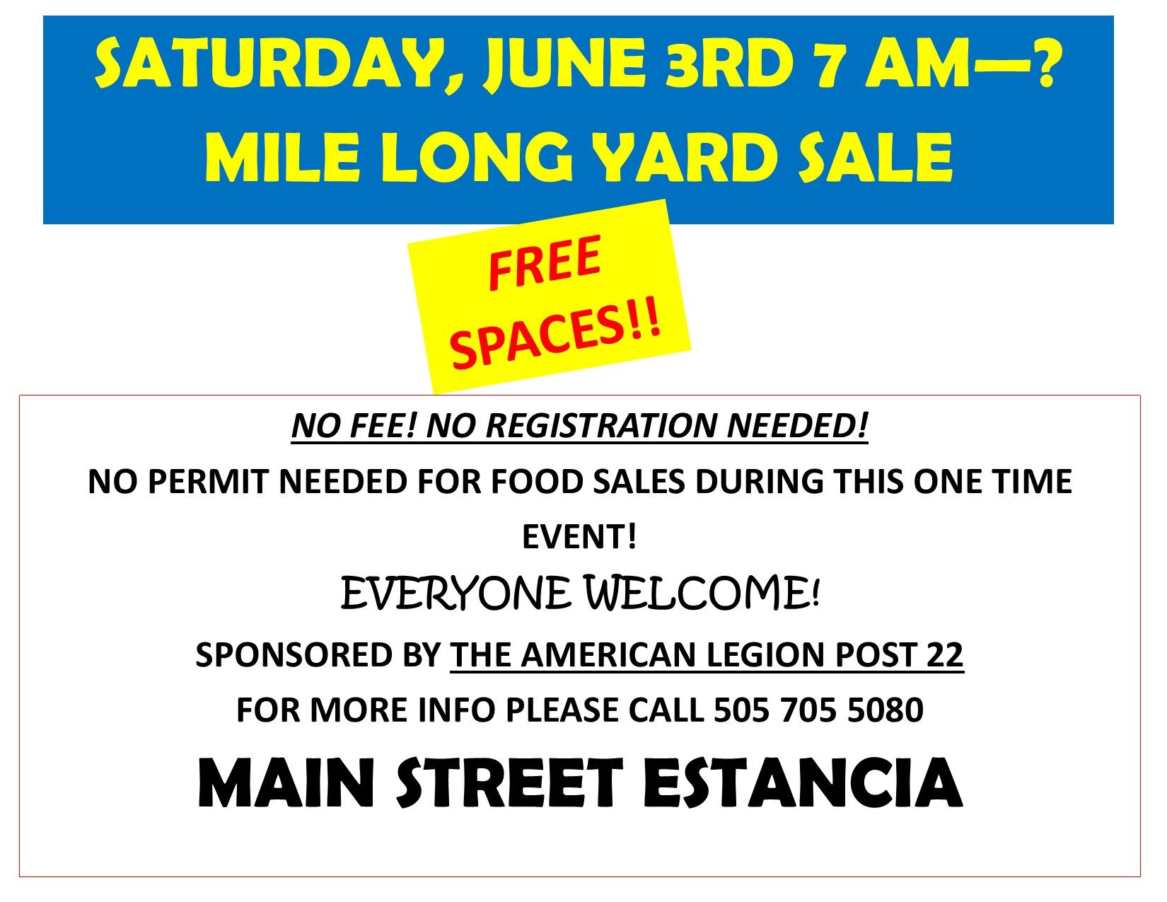 Mile Long Yard Sale, June 3, 2023, beginning at 7:00 AM, Main Street, Estancia, NM 87016.