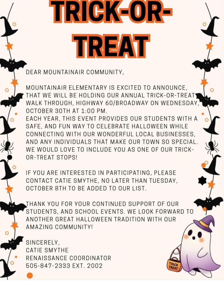 - Those who wish to hand out candy should contact Catie Smythe, 505-847-2333 x2002, no later than October 8, 2025